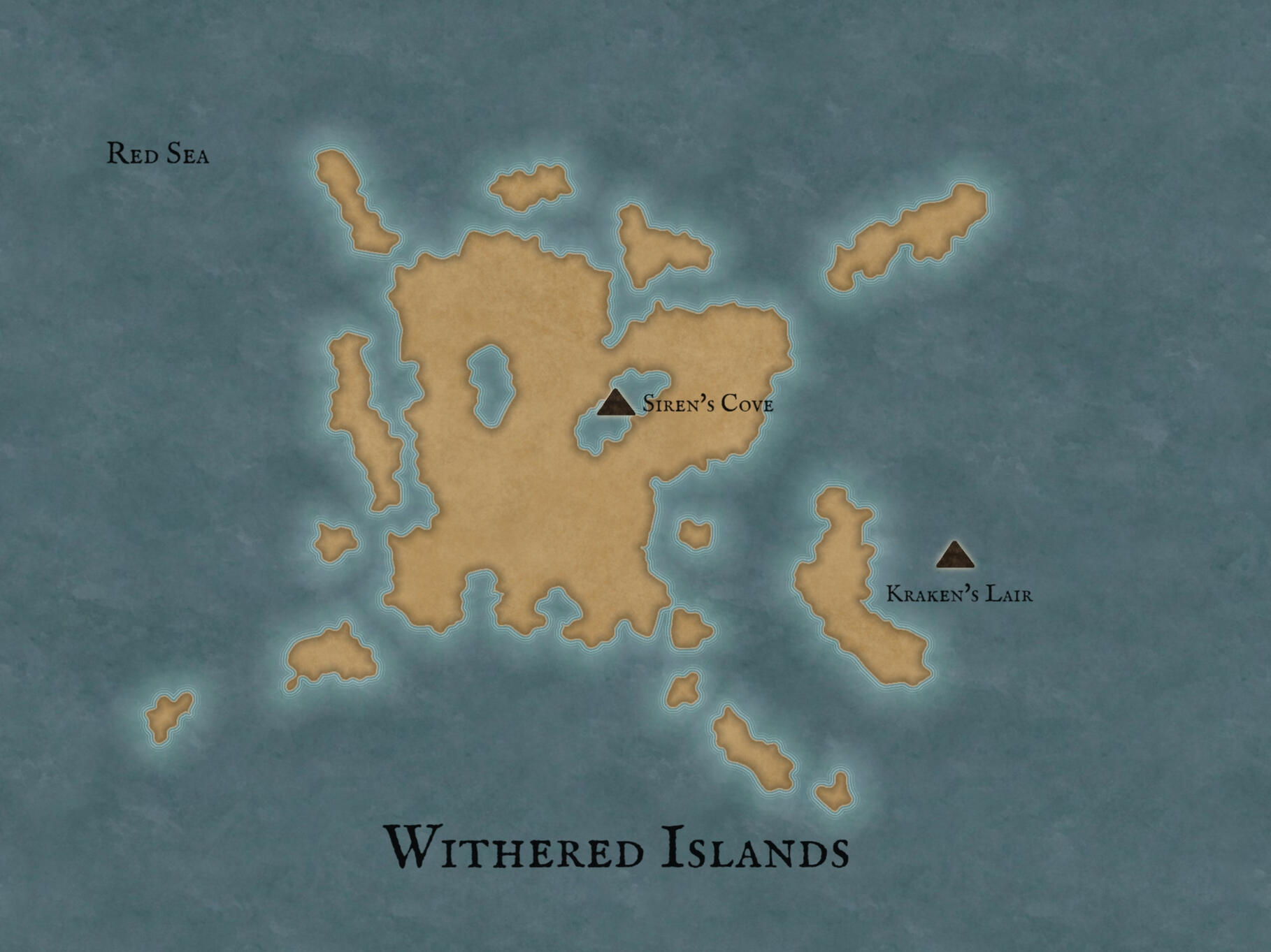 Neither here, nor there, The Withered Islands is still considered as a mysterious place that is rumoured to be located somewhere in the Red Sea. Sailors and voyagers that left for the island have been reported as missing, lost at sea, or have been declared dead.A rumoured survivor has reported to have seen a Siren's cove and even the Kraken's lair, but up to date, there has been no evidence that prove the existence of this person, and the tale remains a rumour. Expeditions that aim to sail for the Withered Islands are required to have the blessing of The Queen of The Gilded Empire and documents that give permission to travel, with a waiver each signed by the expedition's crew.(Please see Captain R. Jackson for more inquiries.)